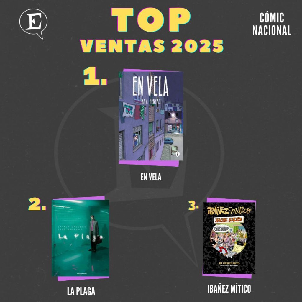 La última obra de Ana Penyas, ‘En vela’, un fantástico ejercicio de reflexión sobre el problema del insomnio en la actualidad, consigue el primer puesto de este top, seguido del sorprendente ‘La plaga’, que firman los hermanos Javier y Juan Gallego. En el tercer puesto aparece la historia inédita de Mortadelo y Filemón publicada por Bruguera en su nueva línea ‘Ibañez mítico’.